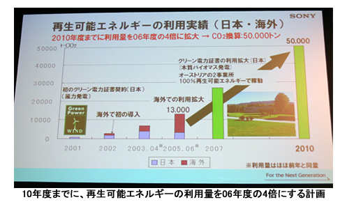 自然エネルギーの利用では、07年10月に年間1600万kWhの電力調達で国内の木質バイオマス発電所と契約。11月にはオーストリアの事業所2か所で使用する、電力すべてを水力発電での調達に切り替えた。ソニーでは07-10年度の間に、自然エネルギーの利用量を06年度実績の約4倍まで拡大する計画。