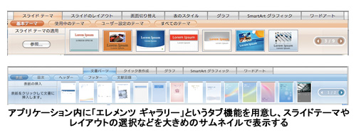 「Office 2008 for Mac」は、「Word 2008」「Excel 2008」「PowerPoint 2008」「Entourage 2008」「Messenger for Mac」の5つのアプリケーションを搭載。Office 2008独自の新しいユーザーインターフェイスとして、アプリケーション内に「エレメンツ ギャラリー」というタブ機能を導入し、スライドテーマやレイアウトの選択などを大きめのサムネイルで表示するなど、使い勝手を高めた。実勢価格は、通常版で4万9800円前後、アップグレード版で2万8000円前後の見込み。