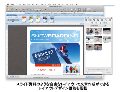 「Word 2008」には、スライド資料のような自由なレイアウトで文章作成ができるレイアウトデザイン機能を搭載。用紙以外の外側のスペースも作業スペースとして使用でき、写真やグラフの加工、ページプレビューなどができる。「Excel 2008」はグラフデザインを強化、カラーやグラデーションなどが変更でき、見栄えのいい編集ができるようになった。また、個人ユーザーやSOHOユーザー向けに、財務管理表が作成できる資産/財務管理シートを新たに用意した。