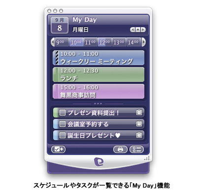 「Entourage 2008」は、電子メール機能やToDo機能などのスケジュールやタスク管理をする「Office 2008 for Mac」の中心的アプリケーション。1日のスケジュールやタスクをガジェットに自動で表示し、時間になると知らせる新機能「My Day」も搭載した。なお、アプリケーションを起動しなくても、「My Day」は利用できる。