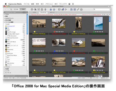 上位バージョン「Office 2008 for Mac Special Media Edition」は、これらの5つのアプリケーションに加え、写真や映像などのデジタルコンテンツを視覚的にカタログ化して管理できるアプリケーション「Expression Media」を搭載。約100種類のメディア形式に対応し、バージョン管理やメタデータの管理を効率的に行える。実勢価格は、通常版で5万2800円前後、アップグレード版で3万2800円前後の見込み。