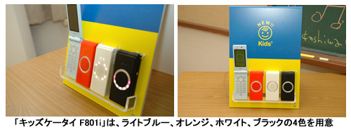 「キッズケータイ F801i」は、「防犯ブザー・電源OFF連動機能」「バッテリーロック」などの従来端末よりも安心機能を強化したのが特徴。
