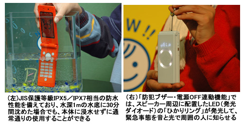 防犯ブザーが使用できない場合でも本体側面の「ちょこっと通知キー」を長押しすれば、位置情報通知サービスを利用して自分の居場所をメッセージで送ることが可能。JIS保護等級IPX5/IPX7相当の防水性能を備えており、水深1mの水底に30分間沈めた場合でも、本体に浸水せずに通常通りの使用することができる。
