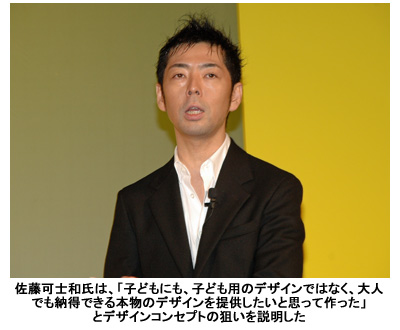 会見で佐藤氏は、「子どもにも、子ども用のデザインではなく、大人でも納得できる本物のデザインを提供したいと思って作った」とデザインコンセプトの狙いを説明した。