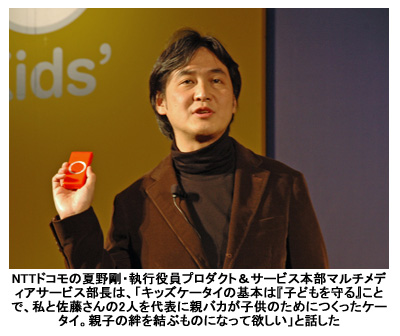 会見でNTTドコモの夏野剛・執行役員プロダクト&サービス本部マルチメディアサービス部長は、「キッズケータイの基本は『子どもを守る』ことで、私と佐藤さんの2人を代表に親バカが子供のためにつくったケータイ。親子の絆を結ぶものになって欲しい」と話した。