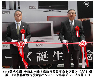 日立製作所は、全日本空輸(ANA)と共同で、液晶テレビ「Wooo(ウー) UT シリーズ」の広告トラックを使ったプロモーション「『Wooo UT シリーズ』誕生記念全国ツアー『Wooo fly about with ANA』」を実施すると発表した。広告の展開にあたり、12月10日には東京・大手町のサンケイビルで出陣式を行った。