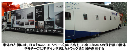プロモーションで使用するトラックの外装は、左側を日立から12月中旬に発売する「Wooo UT シリーズ」の広告、右側はANAの飛行機の機体をモチーフにデザインした。