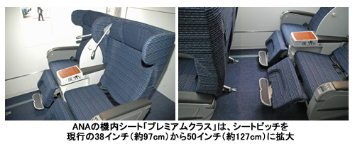ANAの機内シート「プレミアムクラス」は、シートピッチを現行の38インチ(約97cm)から50インチ(約127cm)に拡大した座り心地の良い国内線では最上位クラスの座席を用意。どの時間帯の利用でも機内で食事ができる機内サービスやラウンジでの航空サービスなどのサービスとあわせて提供する。