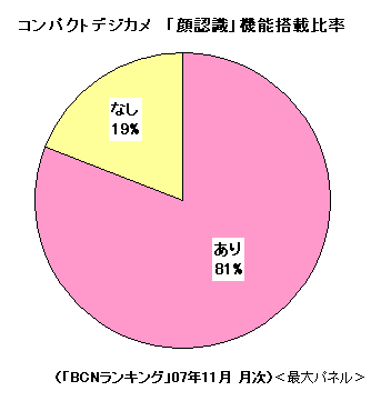 「顔認識」機能も11月の時点で搭載率が80%を超えている。「顔認識」機能とは主に、人物の顔を優先してピントを合わせる機能と、明るさを自動調整する機能を総合したものだ。たとえば人物より手前に花など別の被写体があるとカメラは花にピントを合わせて後ろの人物がボケてしまうことがある。また逆光ぎみの明るい屋外で撮影すると人物を含めて全体的に暗い写真になってしまう。このような場面で「顔認識」機能を使えば、カメラが自動的に「人物の顔」を基準にしたモードに切り替わり、顔を中心にしたピント合わせや逆光補正などを行って人物がきれいに写った写真が撮れるというわけだ。
