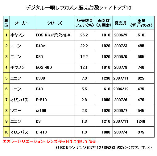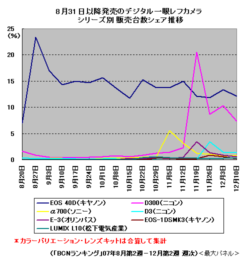 ライバル機種と目される11月23日発売の「D300」も発売時の実勢価格がボディのみで23万円前後という価格ながら、発売日の週(11月19?25日)で一気に20.5%のシェアを取り強烈な立ち上がりを見せた。その後も12月の第2週まで10%前後のシェアを確保している。