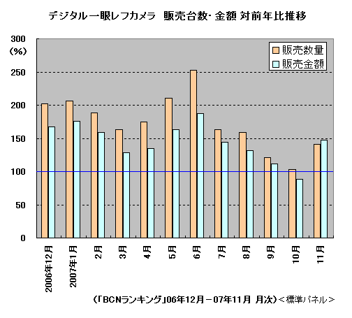 最後に市場全体の動向もみておこう。07年はデジタル一眼レフカメラ市場全体は好調な年だったといえる。前半、販売台数の対前年比は平均200%前後で推移。販売金額も160%前後で推移した。特に夏ボーナス商戦の6月には台数で252.7%、金額で187.3%を記録した。後半はやや鈍化傾向だったが冬ボーナス商戦を迎えた11月には台数で140.6%、金額で147.6%と上昇している。この勢いを12月も維持し、08年以降につなげられるかに注目していきたい。(BCN・岡本浩一)