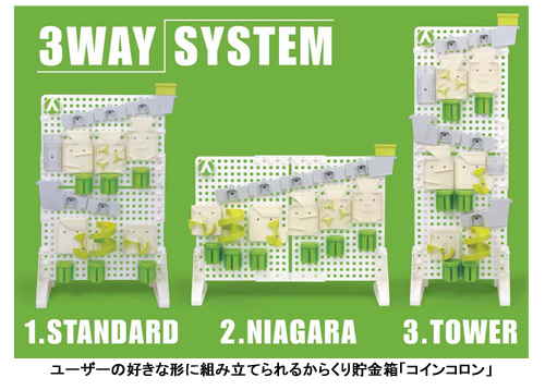 硬貨を投入すると1円から500円までの6種類の硬貨を自動的に分類し、それぞれのコインポットに落ちるからくり貯金箱。A4サイズ2枚のパネル2枚に、硬貨が通る道や、硬貨分類装置、コインポットなどをユーザーが自由に配置できるので、オリジナルの貯金箱を作ることができる。また、滑り台のようなギミックや、風車のような回転式のギミックも付属し、パチンコをしているような楽しさを体感することもできるという。