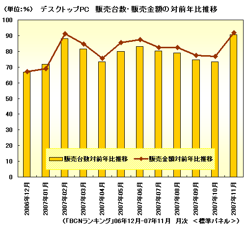 この1年を振り返ると、販売台数・販売金額ともに対前年比で7-8割程度と前年割れで推移してきたデスクトップPC。しかし、11月には台数・金額ともに対前年比で9割になり、Vistaを発売した直後の2月並みに回復してきた。