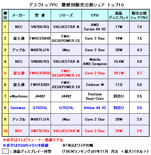 11月の機種別販売台数シェアトップ10では、売れ筋は9-10月頃に各社が相次いで発売した07年冬モデル。冬モデルのほとんどは、OSにWindows Vista Home Premiumを搭載する。形状別では、7機種がディスプレイ一体型、3機種が分離型だ。06年11月時点では44.3%だった一体型だが、07年に入り1月には5割を突破。直近の11月でも50.5%と過半数を占めている。