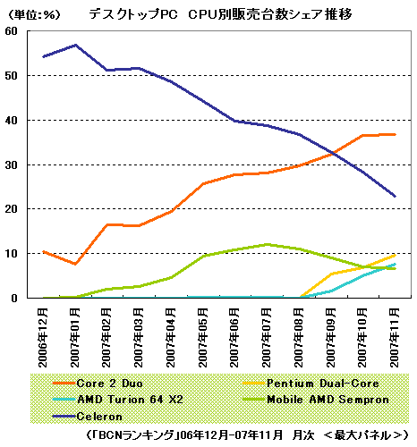 機能面ではどのような変化があるのだろうか。「PCの頭脳」ともいえるCPUの変遷を見てみよう。CPUはこの1年で劇的にシェアが変化した。昨年の冬から今年の夏頃まではCeleronが主流でおよそ4-5割を占めていた。ところが、Core 2 Duoが今年に入って右肩上がりに伸び続け、ついに07年10月にはCeleronと順位が逆転、11月には36.7%と3割強を獲得。Core 2 DuoはデスクトップPCのCPUとして、おおよそ普及してきた。
