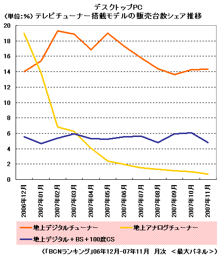 現在、デスクトップPCで2割程度を占める、テレビチューナー搭載モデルについても見ておこう。11月の地上デジタルチューナーのうちわけは、地デジ対応のみが10%台半ば、地上・BS・100度CS対応が5%前後。この1年間、地上デジタルチューナーのシェアはそれほど変わらないが、一方で、地上アナログチューナーは激減。06年12月-07年5月にシェアを急激に下げ、当初10%台後半だったのが、11月には1%を切った状態。テレビチューナーはアナログからデジタルへとほぼ移行したといえる。