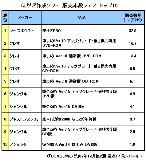 最後にメーカーシェアを見ておこう。1位は販売本数シェア43.1%で「筆まめ」シリーズを販売するクレオ。初心者向け機能が充実していることや、「アップグレード・乗り換え専用DVD-ROM」の価格がソースネクストの「筆王ZERO」よりも少しだけ安いことも影響しているようだ。2位はソースネクストでシェア36.3%。06年までイーフロンティアが発売していた「筆王」の著作権・商標権を取得し、9月7日に更新料無料の「筆王ZERO」として発売して高い獲得している。忙しくて時間が取れない人や、面倒くさがりだけど、年賀状は1月1日に届いて欲しいというワガママな人はこの週末、はがきソフトを買いに走ってはどうだろうか。(BCN・岡本浩一)