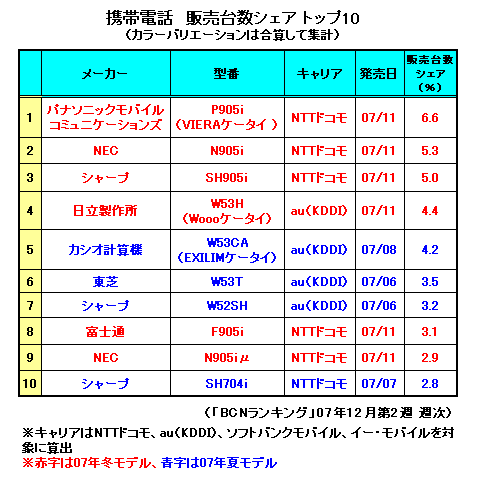 まずは「BCNランキング」の12月第2週(12月10-16日)の週次データで、カラーバリエーションを合算した販売台数シェアで携帯電話の売れ筋トップ10を見てみよう。1位を獲得したのはシェア6.6%でパナソニック モバイルコミュニケーションズの「P905i」(NTTドコモ)だった。