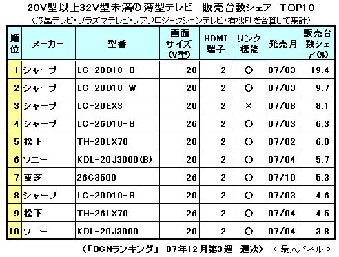 まずは個室や寝室、はてはキッチンなどに置きたい中型モデルのランキングを見ていこう。直近の07年12月第3週(12月17日-23日)の週次ランキングで、1位だったのはシャープの20V型液晶テレビ「LC-20D10-B」だ。販売台数シェアは19.4%で、この1モデルだけで市場の2割近くを占めていた。