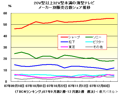 中でもシャープの成長ぶりは目覚しく、10月第1週(10月1日-8日)からぐんぐんシェアを伸ばし始め、9月第2週の46.4%から12月第3週では55.4%を記録した。年末・年始もさらにシェアを伸ばしそうな勢いだ。