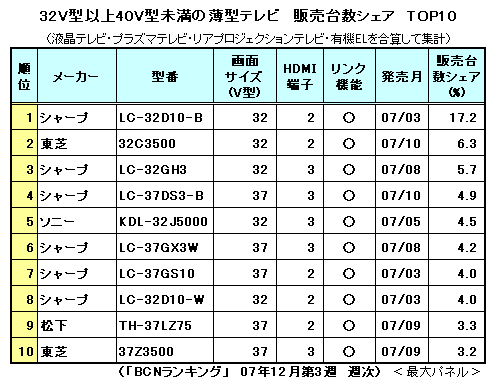 家族みんなが集まるリビング用として人気が高い32V型以上40V型未満の売れ筋を見ていこう。1位はここでもシャープ製で、32V型液晶テレビ「LC-32D10-B」がシェア17.2%を獲得して首位についた。2位は東芝の32V型液晶テレビ「32C3500」。シェアは6.3%だった。