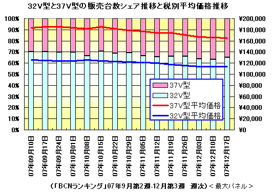 上位10機種では、32V型と37V型がちょうど半々。大型モデル市場全体で見ると、まだ32V型モデルのシェアが65.3%と高いが、平均価格推移を見ると、32V型が15週間で1万2000円ほど値が下がったことに対し、37V型モデルは1万8000円ほども下がり、これが37V型モデルの人気に火をつけたようだ。