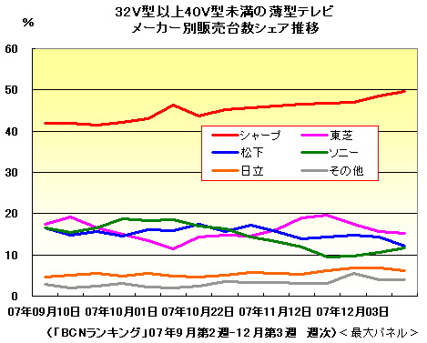 15週に及ぶこの期間、変わらず首位を走っているのはシャープだ。それに続く顔ぶれも変わらず、2位はソニー、3位は松下。なお、4位以下のビクター、東芝はもつれ合うように推移している。