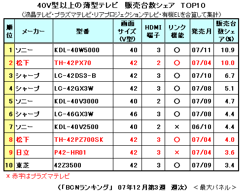 40V型以上では、ランキング上位にプラズマテレビが顔を出すようになる。上位10機種中3機種が占めた。また、12月第3週の42V型モデルの平均価格を比較してみると、液晶テレビが税別22万9000円ほどなのに対し、プラズマテレビは税別18万7000円ほどと4万2000円ほども安かった。この安さでプラズマテレビを選んでいる人もいるのではないだろうか。