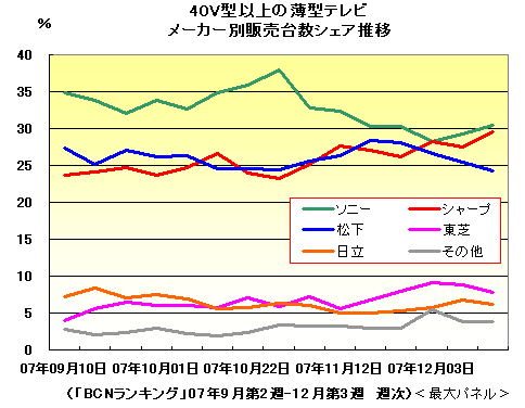 対してシェアを落としたのはソニーと松下で、ソニーは9月第2週の24.5%から、12月第3週の18.2%へ、松下は9月第2週の14.7%から、12月第3週の11.8%へと減少している。