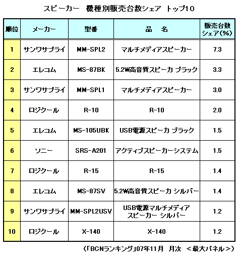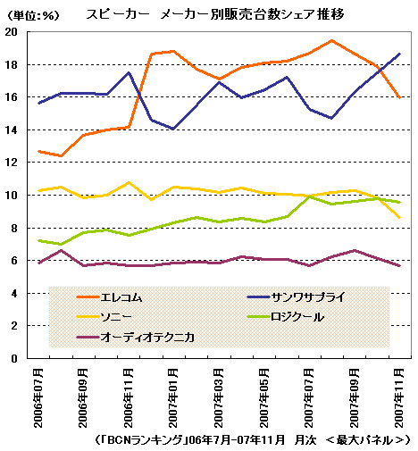 スピーカーのメーカーシェアは06年12月以降、エレコムが1位を維持しており、長い間順位の変動はなかった。しかし11月、サンワサプライがエレコムを抜いてトップに立った。メーカー別販売台数シェアはこの2社で全体のおよそ3割を占め、後に続くのは3位のロジクールと4位のソニーが10%前後、5位はオーディオテクニカが6%前後で推移している。