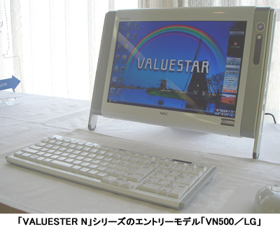 取っ手付きのディスプレイ一体型モデルの「VALUESTER N」シリーズは、17型ワイド液晶と、地上デジタル・アナログテレビチューナーを搭載した「VN770/LG」を追加し、地デジ対応機種の拡充を図った。実勢価格は22万5000円前後の見込み。