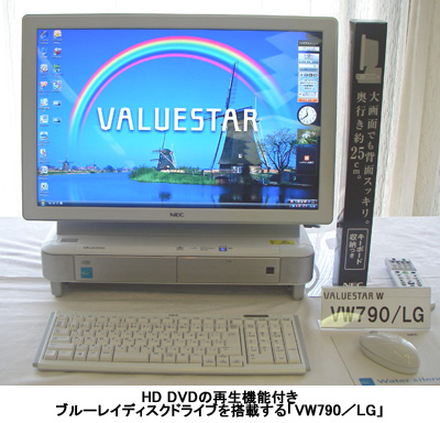 「VALUESTER W」シリーズは、CPUやHDDの冷却に水冷システムを採用した、静音性の高いディスプレイ一体型の上位モデル。22型ワイド液晶を搭載する最上位モデル「VW790/LG」は、ブルーレイディスクの再生・録画に加え、HD DVDの再生にも対応する光学ドライブを採用した。実勢価格は33万5000円前後の見込み。