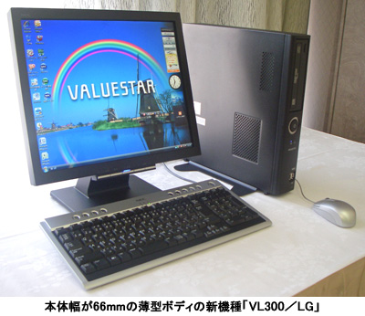 「VALUESTER L」シリーズは、セパレートタイプのデスクトップPC。今回、エントリーモデルとして、本体の幅が66mmの薄型モデル「VL300/LG」を新たに追加した。辞書の背表紙をイメージしたスリムデザインで、エントリーモデルながらCore 2 Duo E4500(2.20GHz)、HDMI出力端子を装備するなどスペック面も充実させた。ディスプレイは17型液晶を付属する。実勢価格は15万5000円前後の見込み。