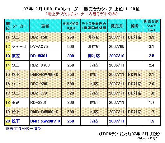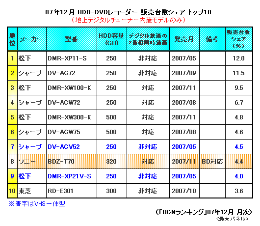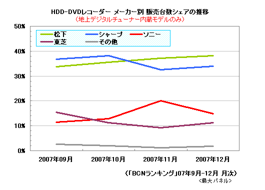 とくにシャープは、HDD内蔵BDレコーダー「BD-HDW15」「BD-HDW20」の発売が当初予定していた12月から1月下旬に延期され、HDDのないBDレコーダー「BD-AV10」「BD-AV1」だけでは満足に戦えなかったようだ。全体でのメーカー別シェアも9月・10月の30%台後半から11月・12月は前半にやや落ち込み、松下がシャープに代わって1位に浮上した。