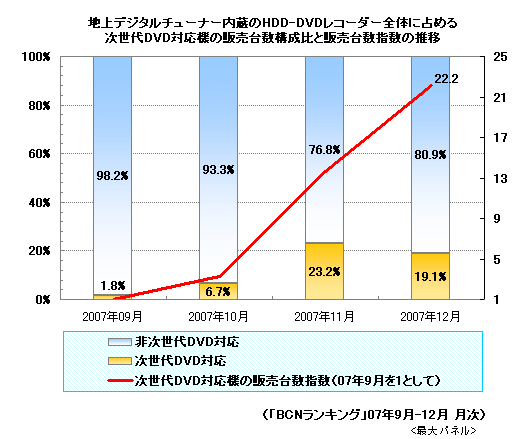 例年、12月は年間で最もHDD-DVDレコーダーが売れる月で、全体の販売台数は前月比1.9倍、次世代DVD対応モデルに限ると同1.6倍を記録した。07年9月の販売台数を1として指数化すると、12月は実に22.2倍を記録。レコーダー全体に占める構成比は微減したものの、台数は以前に比べて大幅に伸びており、レコーダーに限れば、次世代DVD市場は完全に立ち上がったといえるだろう。規格別で見ると、次世代DVDレコーダーのうち、BDが94.9%、HD DVDが5.1%とBD優勢の状況に変化はない。