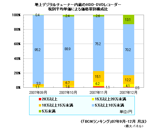 次世代DVDレコーダーが売れ始めたのは、07年11月から。注目度の高さの割に、地デジチューナー内蔵HDD-DVDレコーダー全体の販売台数に占める次世代DVD対応モデルの割合は06年11月から07年9月までは0.9-1.8%と低調だった。それが翌10月に6.7%、11月には23.2%と、大きく上昇。12月も19.1%と前月並みの水準を維持した。さらに5万円ごとに区切った税別平均単価の価格帯別構成比を集計すると、同じタイミングで次世代DVD対応機がほとんどと見られる、10万円以上の割合がやはり1ケタから急上昇している。
