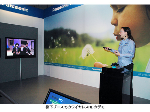 「これからはケーブルはいりません」――7日の基調講演で松下電器産業の坂本俊弘・パナソニックAVCネットワークス社社長は、そう言って聴衆の前でケーブルを切った。そして開発したシステムを用い、ビデオカメラの映像を薄型テレビに転送して見せると、会場からは驚きの声があがった。松下は、自社のブースでもデモンストレーションを実施。来場者の映像を撮影した無線機能内蔵のビデオカメラを無線機能を備えたワゴンにのせ、その映像を薄型テレビに転送してみせた。