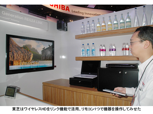 東芝も、「ワイヤレスHD」を利用し、薄型テレビなどに採用しているリンク機能「レグザリンク」を応用した次世代のリンク機能を公開。無線回路を搭載したHD DVDプレーヤーやノートPCを、HDMIケーブルを使うことなく、テレビのリモコン1つで操作できるデモを行った。