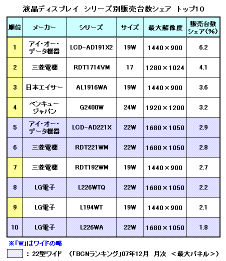 大型化に伴い、画面のワイド化も顕著だ。07年1月は販売台数シェアで25.5%だったワイドタイプが、12月には69.5%まで増加。12月のシリーズ別販売台数シェアトップ10をみても、10モデル中9モデルがワイドタイプになっている。