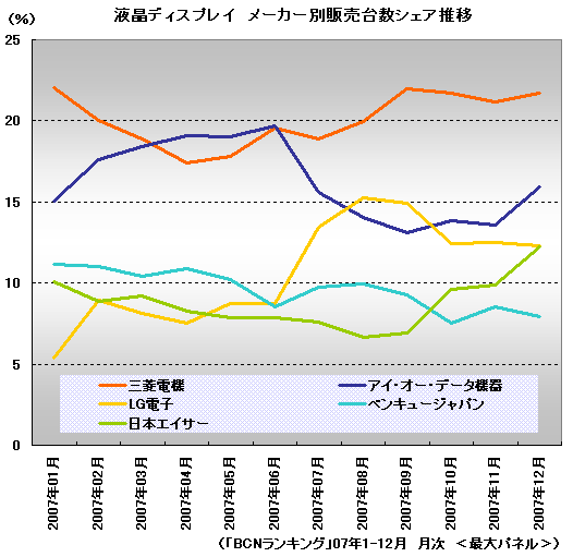 メーカー別では、1年を通じて20%前後で推移した三菱電機がトップ。07年に販売台数が最も多かったメーカーを表彰する、「BCN AWARD 2008」の液晶ディスプレイ部門を受賞した。春頃は、アイ・オー・データ機器が三菱電機を一時的に追い抜いたこともあったが、夏以降、2位以下はアイ・オー・データ機器、LG電子、ベンキュージャパン、日本エイサーがいずれも10%前後で推移する混戦が続いている。(BCN・井上真希子)