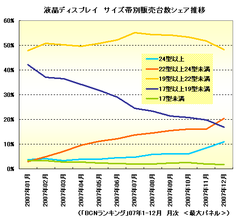 一方、右肩上がりなのは22型以上24型未満のクラス。07年1月は1割にも満たなかったが、12月にはおよそ2割まで増加して17型以上19型未満を追い越し、ついにサイズ帯別で2位に拡大した。人気は22型で、従来売れ筋だった17型を抜いて、12月ではシェア20.3%を獲得している。