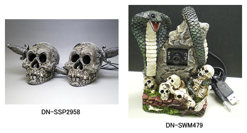 「スカルWebカメラ」は、ドクロとコブラをデザインしたオブジェのようなWebカメラ。ドライバをインストールし、「amcap」というアプリケーションを立ち上げるだけで使用できる。カメラの左右に青白く光るライトを備え、コードの途中についたコントローラで明るさを調節する。カメラ部分は、手動で角度を変更することが可能。ビデオサイズは640×480(VGA)、フレームレートは30fps/sec、重さは515g。対応OSはWindows Vista/XP/2000。価格は3999円。