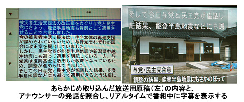 従来の字幕制作は、放送前に設定したあらかじめ予想される単語から、機械がアナウンサーの発話内容を認識し、その結果を手動で修正して字幕テキストを流す「リスピーク音声認識方式」や、放送用原稿を手動で変換して字幕テキストを作成し、アナウンサーの発話に合わせてスタッフが字幕を流す「字幕テキスト主導送出方式」などが主流。最低でも放送前作業に30分-1時間程度かかり、放送中も字幕を流すスタッフが2-5名待機していなければならないなどの制約があった。