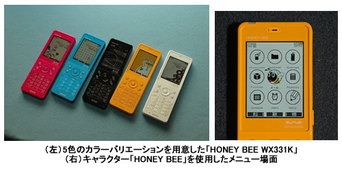 「HONEY BEE WX331K」は、薄さ9.9mmの本体にアンテナを内蔵させたストレートタイプの端末。ポップなカラーと特殊加工を施したキーデザインを採用したデザインが特徴。「デコラティブメール」の作成も可能で、「HONEY BEE」というミツバチをモチーフにしたキャラクターを、メニュー画面やデコラティブメールとして使用することもできる。
