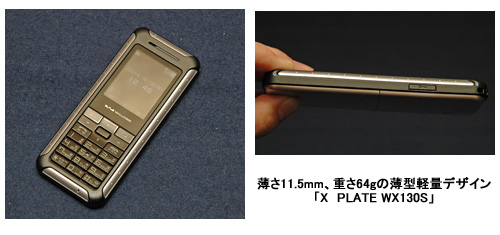 「X PLATE WX130S」は、ウィルコム最軽量という重さ約64gを実現したストレートタイプの端末。タイと台湾での国際ローミングに対応するほか、PIMカードスロットを搭載し中国での使用も可能。PIMカードを使用すると、中国現地での手続きが必要になるが、中国国内の市内電話が1分約3.2円という格安で通話できる。液晶サイズは1.8インチ。本体サイズは幅47.3×奥行き11.5×高さ110mmで、重さは約64g。カラーはシルバーのみで、2月下旬に発売する。