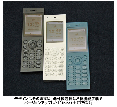 「9(nine)+」は、現行のモデル「9(nine)」のデザインを継承し、新たに赤外線通信機能を追加。著作権保護のDRMコンテンツと前面着信LEDにも対応する。液晶サイズは2.0インチ、本体サイズは幅40×奥行き11.5×高さ124mmで、重さは約71g。カラーと発売日は、フレンチブラックが1月31日、ポーラホワイトが2月中旬、ブリティッシュブルーは2月下旬の発売予定。