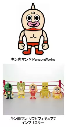 「キン肉マン×PansonWorks」は、独特のタッチで20?30代の男女を中心に人気のあるデザイナー「PansonWorks」と、「キン肉マン」とのコラボレーションによって生まれたキャラクター。力強くかっこいい「キン肉マン」に登場するキャラクターに、「PansonWorks」の描く癒しと元気を融合し、中性的なイメージを盛り込んだ。丸く愛嬌のあるシルエットが男女を問わず人気を集めており、07年2月に販売を開始した「キン肉マン ソフビフィギュア インブリスター」シリーズは、これまで79種類のキャラクターが製品化され、累計25万個を販売している。