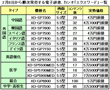 サイズは「XD-SP」シリーズが幅146×奥行き102×高さ21.9mm、「XD-GP」シリーズが幅152×奥行き110×高さ21.9mmで、重さはそれぞれ295gと335g。主な製品のコンテンツ数と実勢価格は、総合型の「XD-GP6900」が100コンテンツ収録で5万円前後、英語強化型の「XD-GP9700」が55収録で5万7000円前後、中国語型の「XD-SP7300」が29コンテンツ収録で4万円前後、中・高校生向けの「XD-SP2500」が65コンテンツ収録で3万3000円前後。