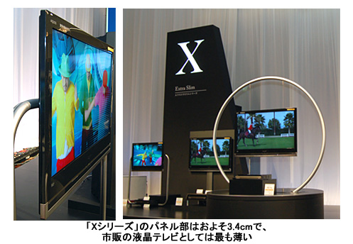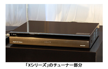 「Xシリーズ」は、超薄型液晶パネルの採用と部品の集積化で、国内市販の液晶テレビとして最薄の3.44cmを実現。ディスプレイとチューナーを分離させて、設置の自由度も高めた。倍速フルハイビジョン(フルHD)表示が可能で、視野角は上下左右とも176度、コントラスト比は15000:1。本体の薄型化に合わせて新たに開発した3ウェイ8ユニットで構成するボックスタイプスピーカーも搭載した。液晶ディスプレイとチューナーはHDMIケーブルで接続。3基のHDMI入力端子をはじめ、D5入力端子3基、LAN端子なども備える。デザインは「AQUOSブルーレイ」と統一。設置した時の見た目にも配慮した。本体サイズは幅43.0×高さ7.1×奥行き31.8cm、重さは4.7kg。