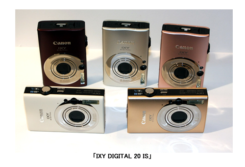 「IXY DIGITAL 20 IS」はシルバー、ピンク、キャメル、ブラウン、ホワイトの5色をラインアップ。滑らかな曲線を取り入れた「カーバチャーデザイン」を採用するなどで主に女性をターゲットにする。有効画素数は800万画素で光学式手ブレ補正機能を搭載する。レンズは光学3倍ズームで、静止画撮影のほかVGA(640×480画素)の動画も撮影できる。